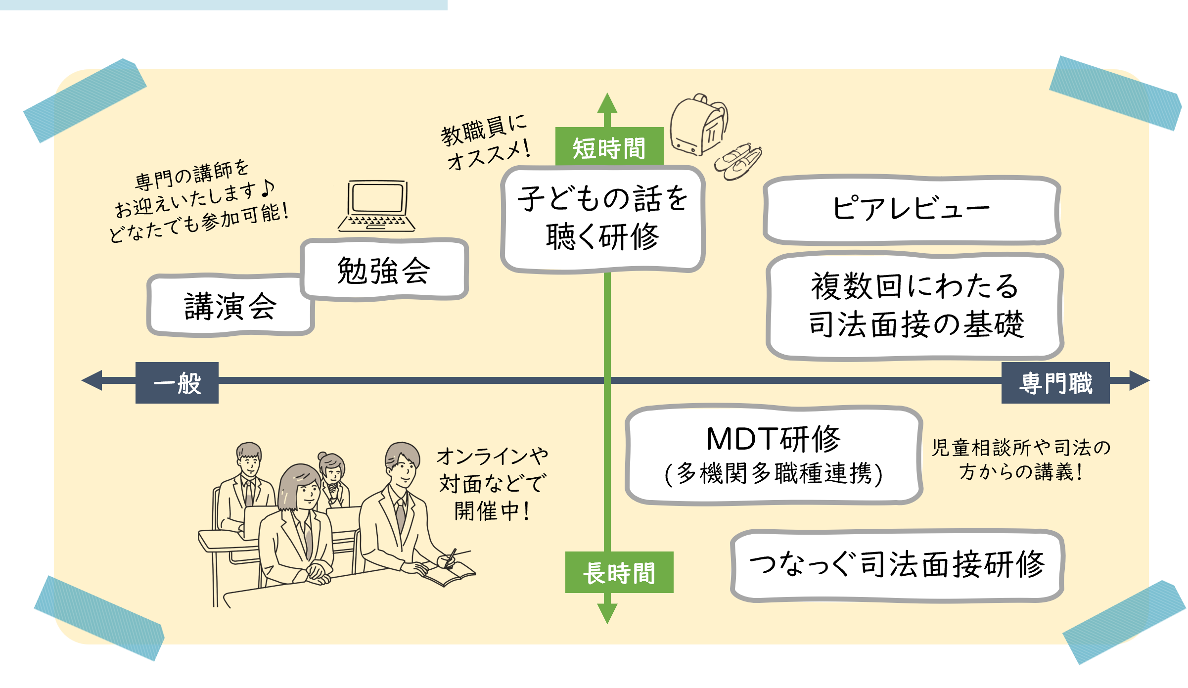 司法面接について学ぶ研修や、面接スキルをブラッシュアップする研修も開催しています。